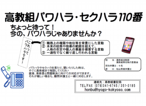 パワハラ・セクハラ、ハラスメントご相談窓口高教組は職場でのハラスメントの相談の窓口を開設しています。相談内容によっては、弁護士を交えての相談もできます。もちろん、相談内容の秘密は守ります。