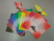 私がこの代表団に参加するに当たって準備したものは、ニューヨーク市民と交流するための「原爆詩折り鶴」でした。自分の拙い英語を補うために、峠三吉の原爆詩「人間をかえせ」の英訳を印刷した折り紙で、“日本の文化=平和の折り鶴”を高教組の仲間や家族・友人に数百羽折ってもらいました。それを署名してくれた人へのお礼に、またはパレードをしながら沿道にいる子どもに配りました。その場では、大抵「Wow!Beautiful!Thank you.」と受け取ってくれますが、その後折り紙をひらいて詩を読んで、何かを感じてくれた人がどれ位いたのだろう…と気になるところです。