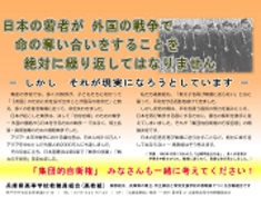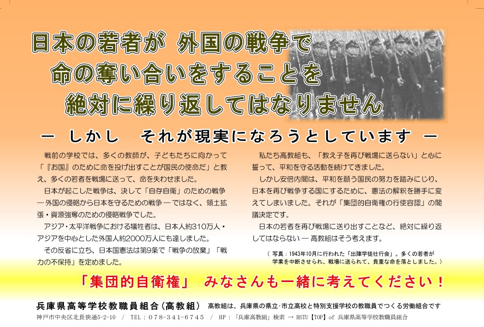 日本が「戦争する国」となれば、戦場に行くのは若者たちです。その時当事者となる可能性のある高校生たちに今日本で起こっている危険な動きを知らせ、彼らが自ら判断し、行動する主権者に成長させることが、私たち教職員の責務と考えて、今回「高校生向けチラシ」を作成しました。